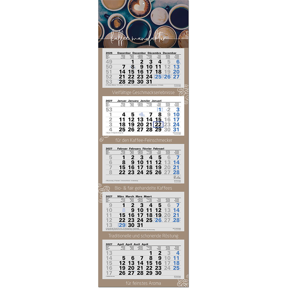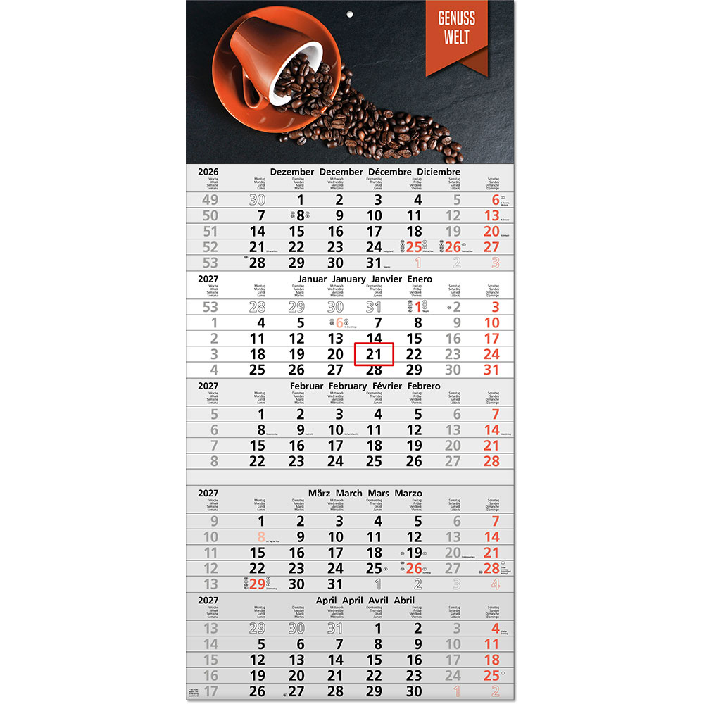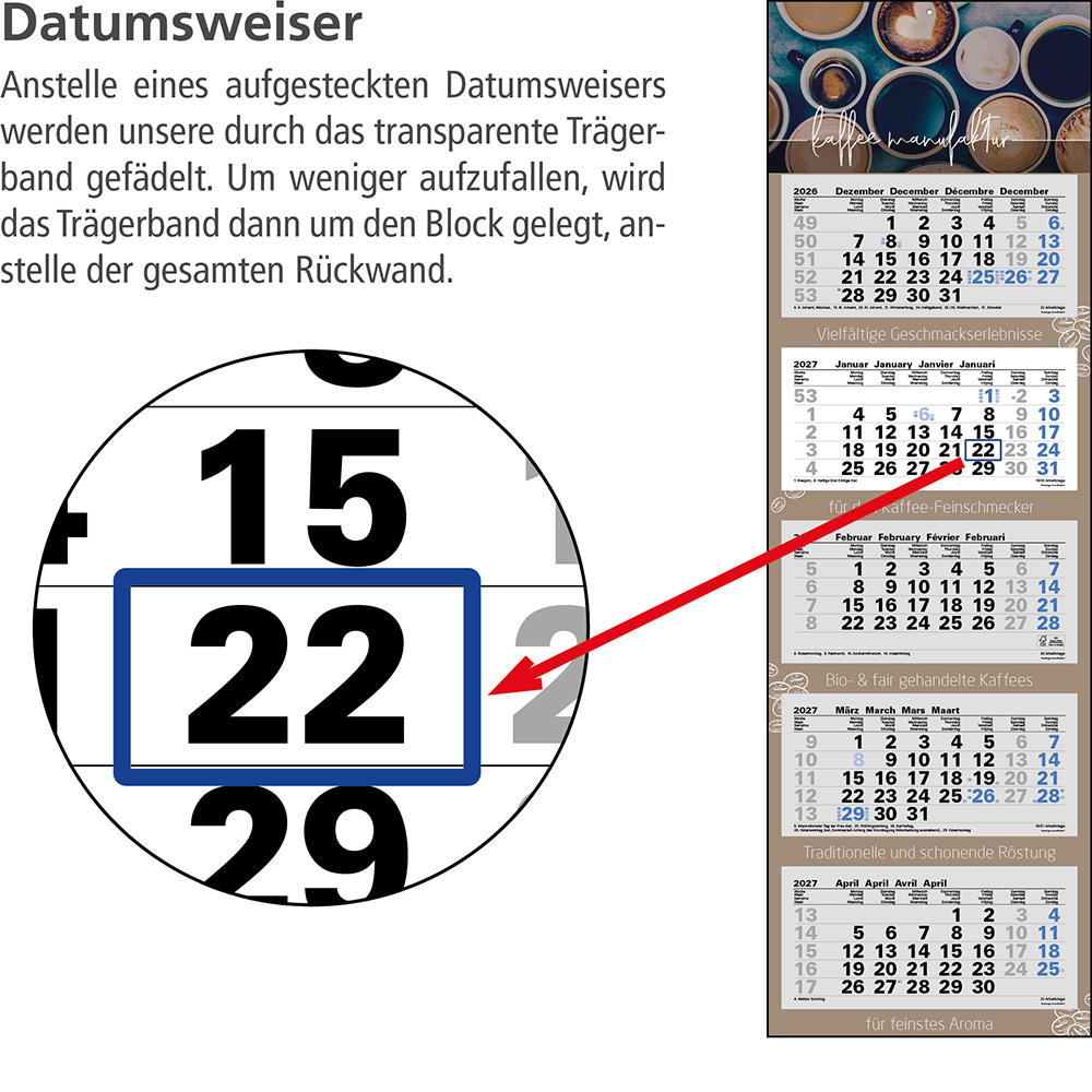 Das Klarsicht-Trägerband ist durch das Fenster (blau) des Datumsweisers hindurchgefädelt, um ein Abfallen des Fensters zu vermeiden. Der Datumsweiser ist um den Monatsblock (nicht den gesamten Kalender) umgelegt. Metallöse zum sicheren Aufhängen des Kalenders Microperforation der Monatsblöcke für ein rückstandsfreies und einfaches Abreißen der Blätter |