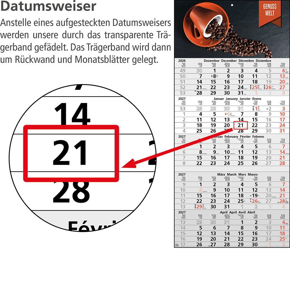 | Besonderheiten | Das Klarsicht-Trägerband ist durch das Fenster (rot) des Datumsweisers hindurchgefädelt, um ein Abfallen des Fensters zu vermeiden. |